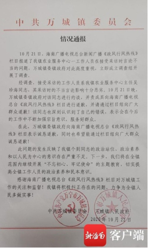 通报查实,接受采访的是镇农业服务中心主任吴珍海,“其采访时的不当言论影响十分恶劣……反映了政治站位,政治素养和以人民为中心的意识存在严重不足”。