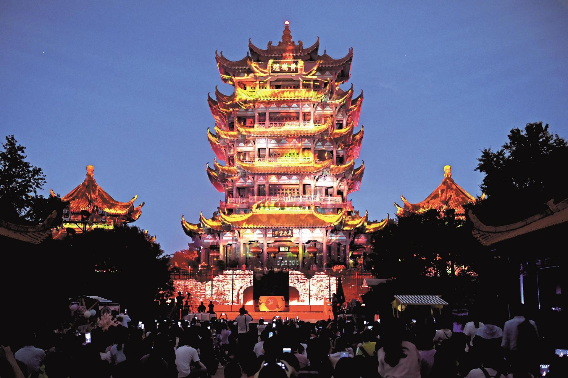 黄鹤楼主楼光影秀。(湖北日报全媒记者 李溪 摄)