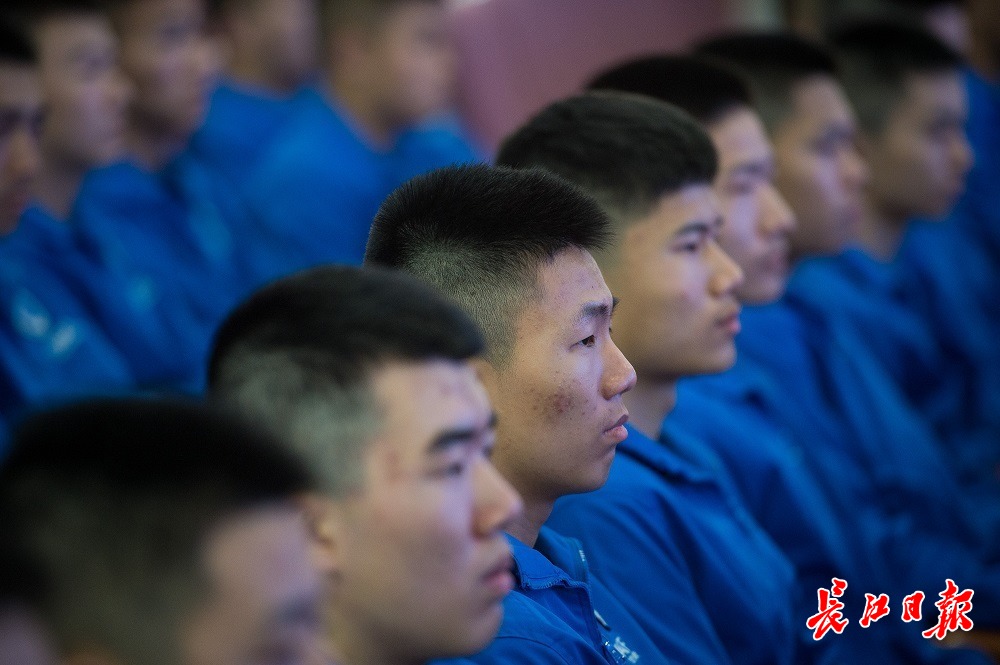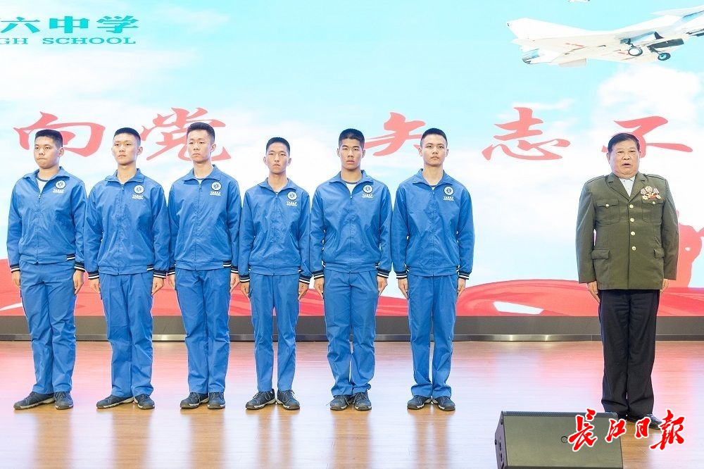 在武汉市第六中学报告厅,电子显示屏上有“铁心向党 矢志不移”8个大字。武汉市第六中学空军青少年航空学校87名学员身着蓝色训练服聆听李明龙和褚新国的演讲。学员们端坐在报告厅内,双手平放在膝盖上,后背挺得笔直。
