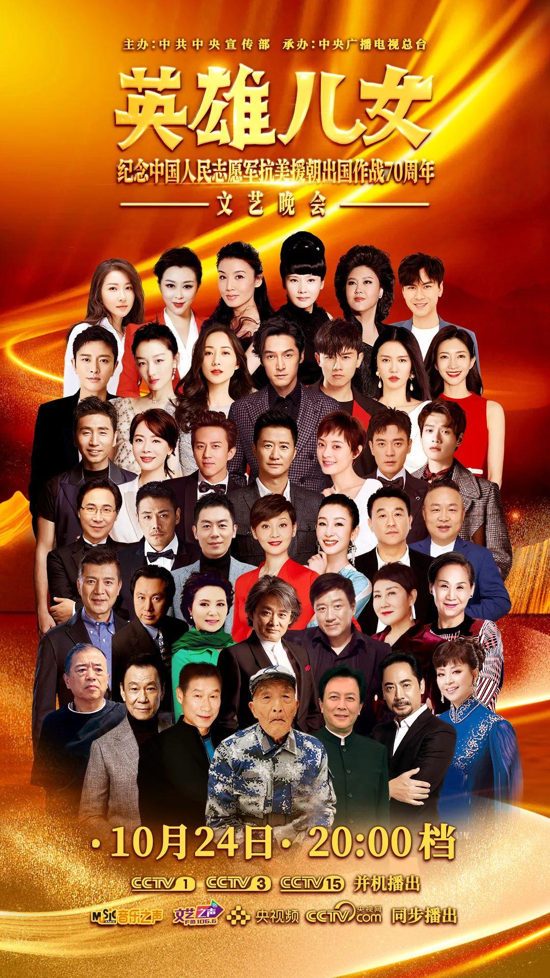 《英雄儿女——纪念中国人民志愿军抗美援朝出国作战70周年文艺晚会》将于10月24日晚八点档CCTV-1综合频道、CCTV-3综艺频道、CCTV-15音乐频道并机播出,音乐之声、文艺之声、央视频、央视网同步播出。天地英雄气,千秋尚凛然,向伟大的中国人民志愿军英雄们致敬!
