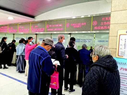 此时,这家医院唯一一个现场挂号的窗口——面向70周岁以上老年人的窗口,已经排起了长队。老人们一个比一个来得早,仍有点儿神色紧张。