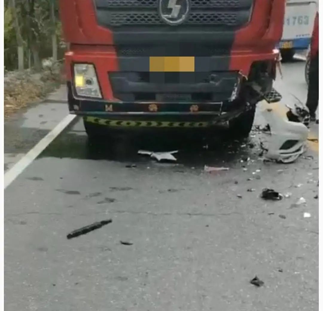 另外一段视频则显示,一辆大货车停在双向两车道的道路一侧,车头左下方有撞击痕迹。在大货车前方,有一些汽车保险杠的白色碎片。