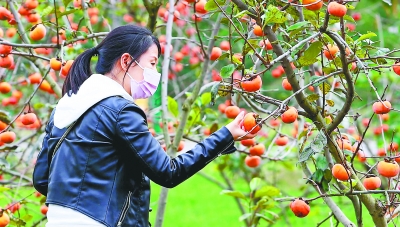市民利用休息日驾车前来游玩采摘柿子。记者杨涛 摄