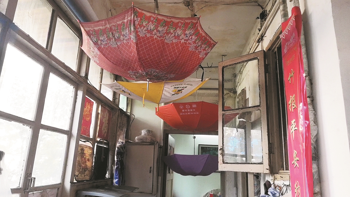 瞿女士家位于武昌区徐家棚街长轮社区武车三村4楼。10月24日,楚天都市报记者来到现场看到,瞿女士家里倒挂了8把雨伞(如图),花花绿绿很惹眼。瞿女士称,挂这些雨伞并不是为了装饰,而是一遇下雨天就要防漏雨。