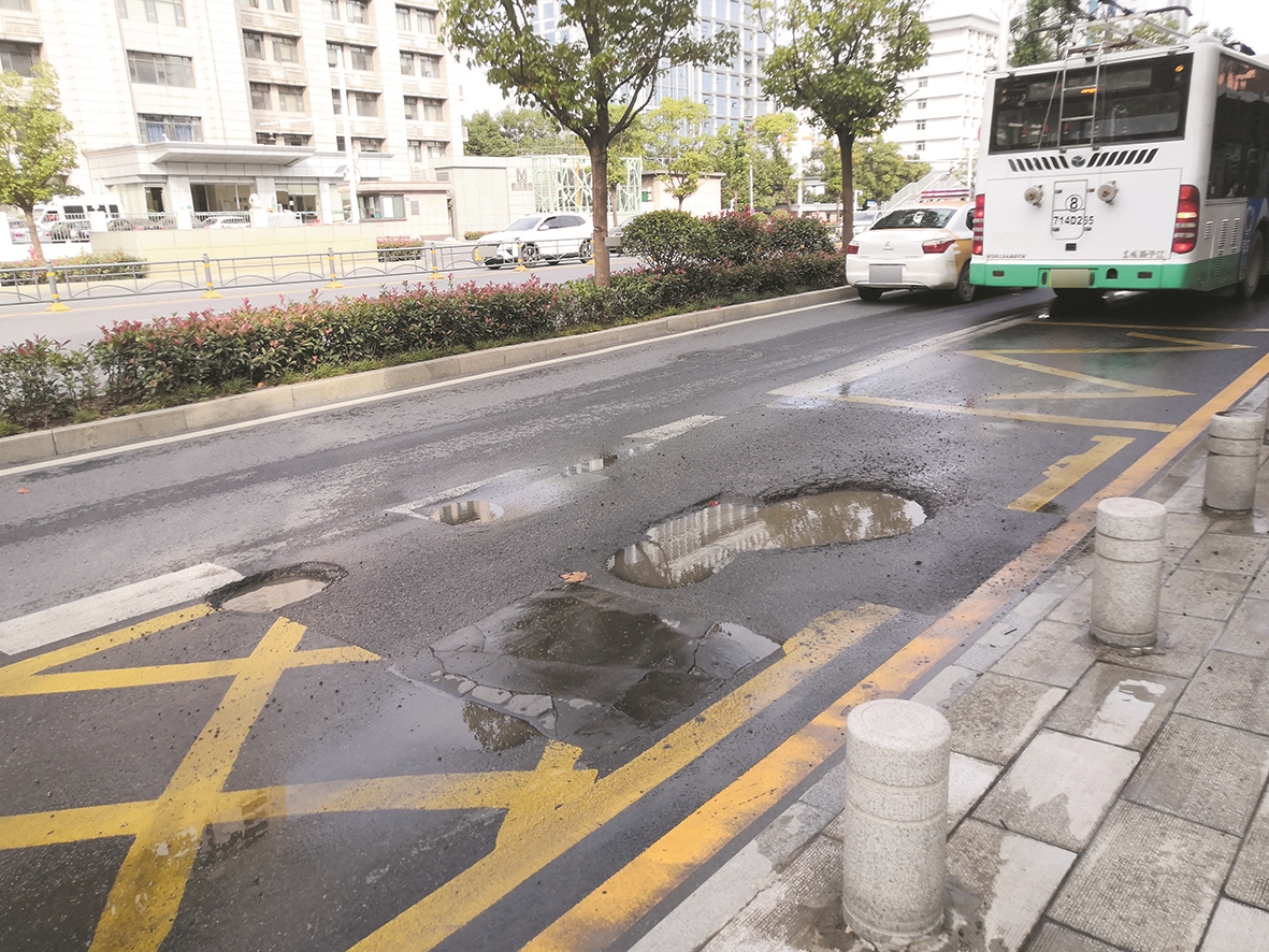 昨日上午9时许,楚天都市报记者在现场看到,最内侧的公交专用道上有四处破损。这几处破损路面,最大的一个坑洼长约1.6米、宽约1米,坑中还有近10厘米深的积水。记者在附近观察发现,路过车辆轧过坑洼时,会溅起坑中积水(如图),车辆会有不同程度颠簸。