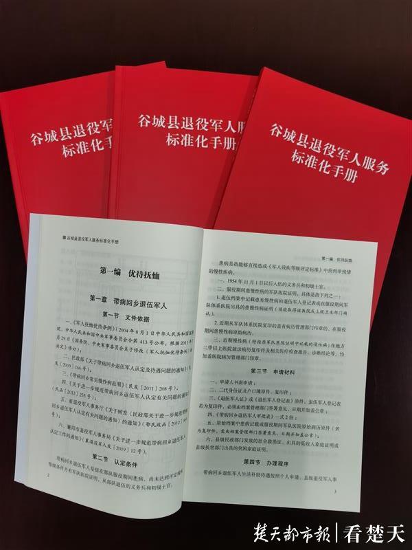 据了解,谷城县退役军人事务局成立以来,始终坚持以退役军人为中心,在全县退役军人中扎实推进“三安行动”(组织安家、岗位安业、思想安心),并结合基层实践,编印了《谷城县退役军人服务标准化手册》,通过综合、简洁、易懂的形式,让退役军人和其他优抚对象看得懂、用得上,让基层退役军人事务工作者好掌握、思路清,真正让“普惠 + 优待”理念落地生根,实现国家惠民惠军政策精准“滴灌”,打通服务退役军人及其他优抚对象“最后一公里”,全面提升广大退役军人和其他优抚对象的光荣感、获得感、幸福感。