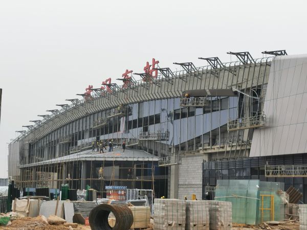 28日中午,长江网记者来到百川路,透过车站施工围挡看到,车站主体南面顶端,武汉东站四个红色大字已经安装好,施工人员正在主体外墙上施工。一名施工人员透露,站牌是前几天刚刚装好的,北面也会挂上。目前正在安装玻璃幕墙,内部装饰也基本完成。