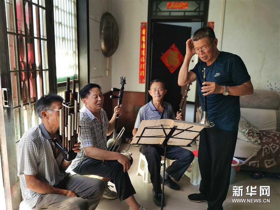 在河南省鲁山县瓦屋镇楼子河村,村民在楼子河村支部书记周莹贤家磨合新的曲子(7月20日摄)。新华社记者 史林静 摄