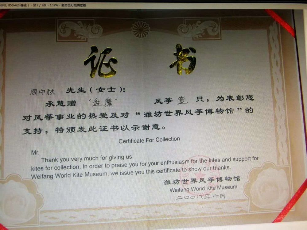 周中秋的盘鹰风筝捐赠证书。周中秋本人提供