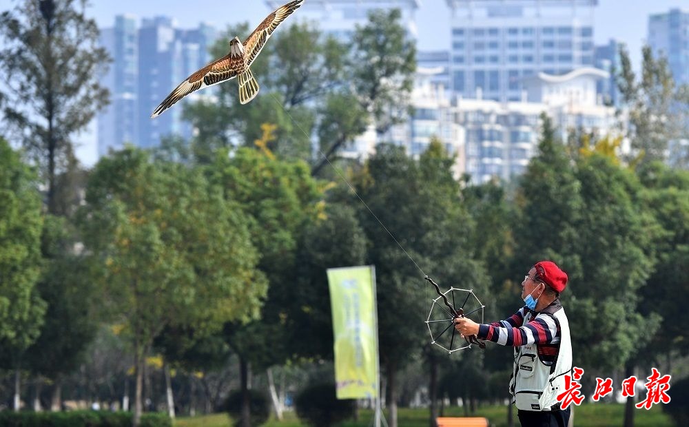 今年67岁的周中秋曾是武汉市第12中的一名体育老师,是一名玩盘鹰风筝有15年时间的资深玩家。“盘鹰风筝是中国传统风筝,一只盘鹰风筝手工制作的时间需要一周,包括扎、糊风筝骨架,绘画雄鹰,再放飞多次调试成功后才算做好了一只盘鹰。”周中秋说,第一次在武昌江边看到有人玩盘鹰就被吸引住了,“通过手上的技巧,让风筝像真的雄鹰一样自由翱翔,一会快速低空拉高,一会向下俯冲,这是一种全身性的户外运动,既有娱乐性也能锻炼身体。”