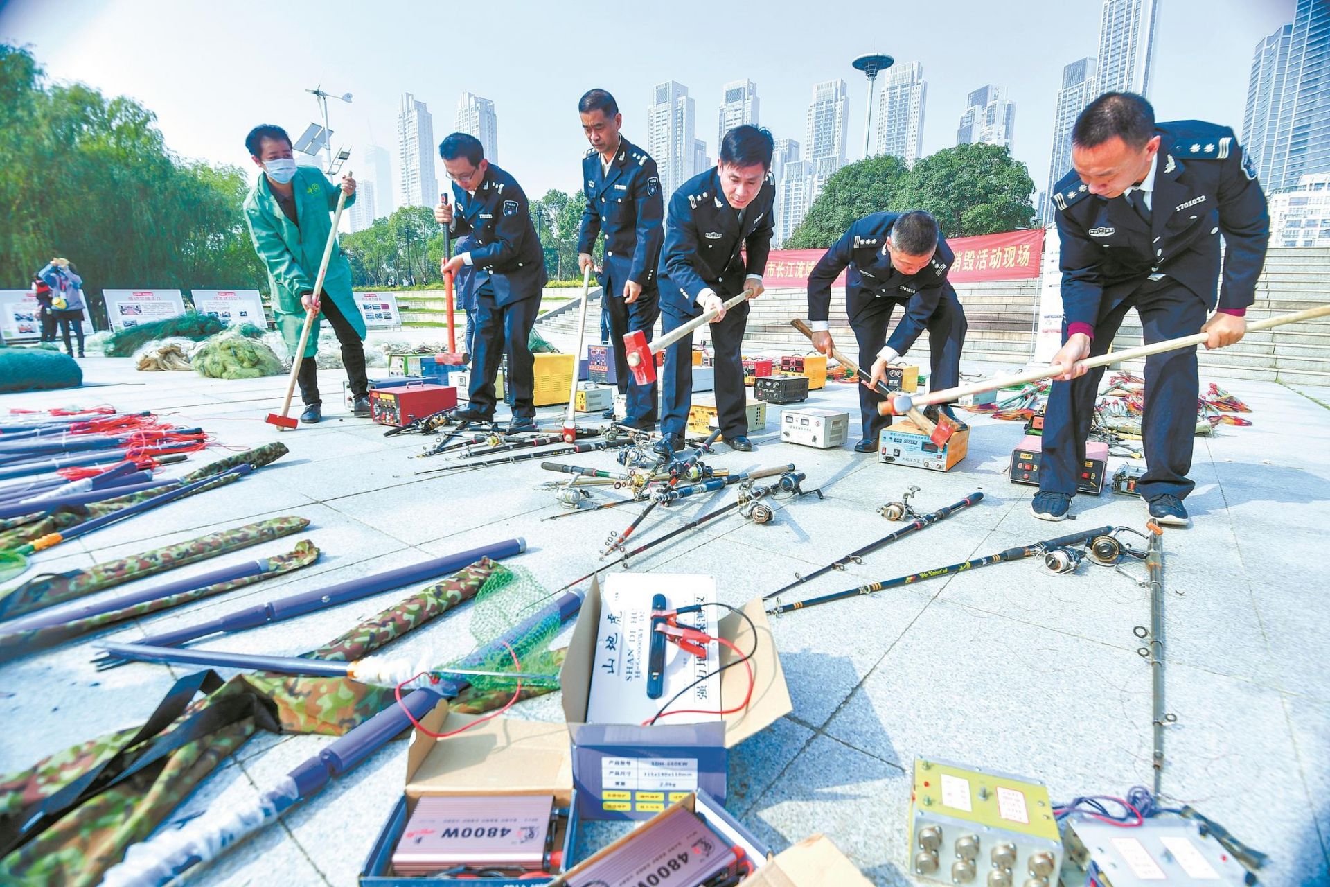 昨日,武汉市禁捕办在市渔政码头销毁长江流域重点水域非法捕捞器具,现场共销毁“三无”船舶3艘,非法捕捞器具489件。昨日,该市各区还设有15个分销毁场所,共销毁“三无”船舶85艘,非法捕捞器具3923件。渔政部门表示,这是从源头上整治长江禁捕违法违规行为的有效举措,旨在努力营造“不敢捕、不能捕、不想捕”的良好禁捕氛围。