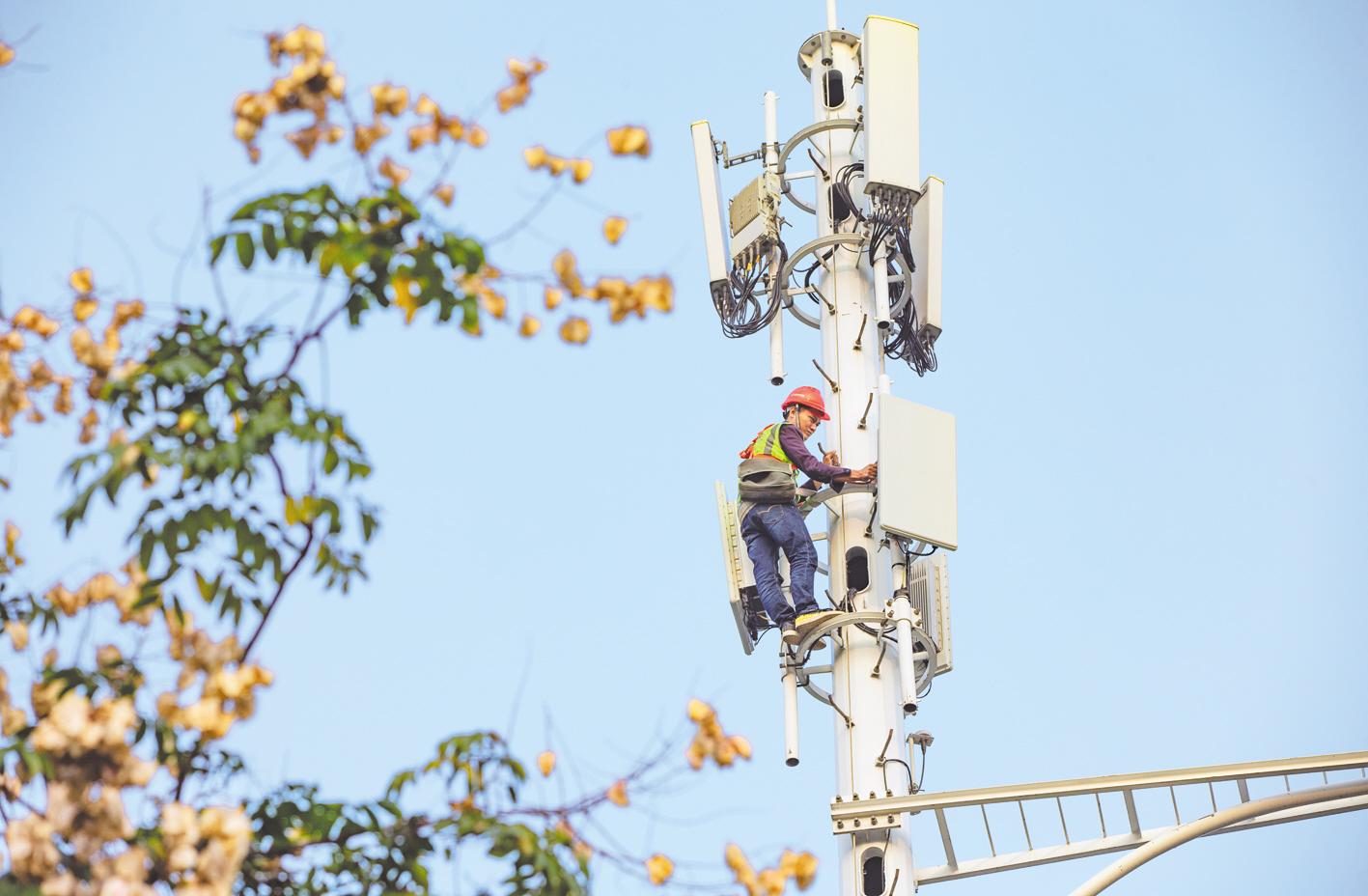10月29日,在襄阳市襄城区岘山文化广场,中国移动通信集团襄阳分公司工作人员在检查5G设备。据襄阳市经信局统计,截至10月27日,该市已建成5G基站1600多个,基站建设规模居全省第二。