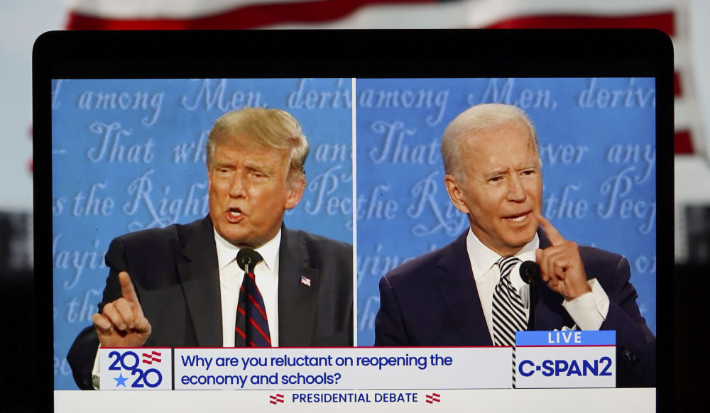 9月29日在美国弗吉尼亚州阿灵顿拍摄的视频画面显示,美国总统特朗普(左)与美国民主党总统候选人拜登在俄亥俄州克利夫兰市参加2020年美国总统候选人首场电视辩论。(新华社记者刘杰摄)