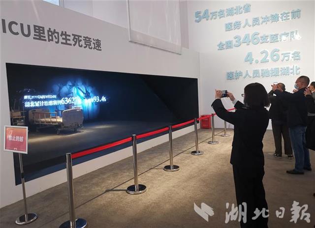 上午9时45分,展区专设的烈士墙前,电子屏显示为王兵等14位抗疫烈士献花致敬的人数已达22719人。湖北经济学院的几位同学默默肃立,依次上前按下电子按钮,为英雄献花。生动的展览,诠释着伟大的抗疫精神,涤荡着年轻学子的心灵。