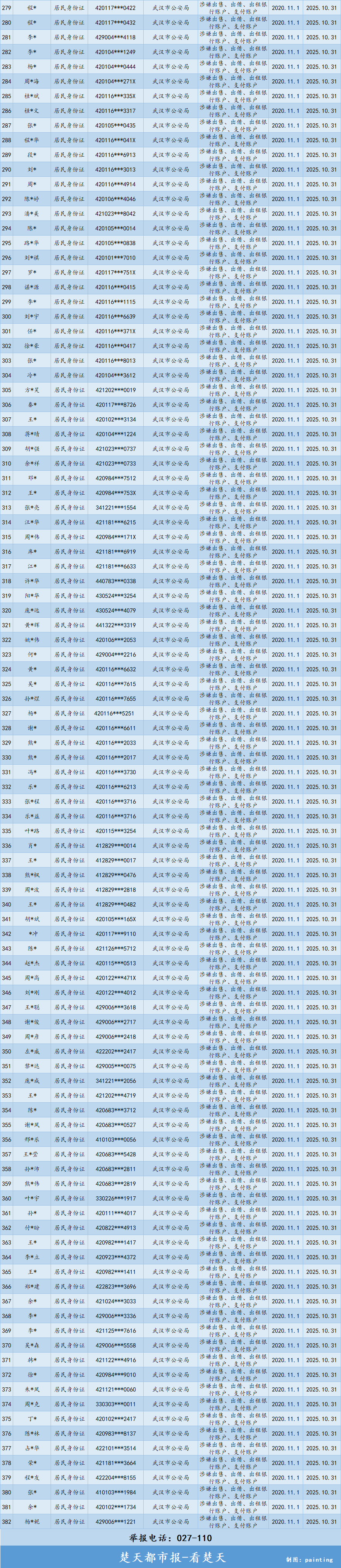 同时,武汉警方还联合中国人民银行武汉分行营业管理部,按照《中国人民银行关于进一步加强支付结算管理防范电信网络新型违法犯罪有关事项的通知》(银发〔2019〕85号)、《中国人民银行公安部对买卖银行卡或账户的个人实施惩戒的通知》(银发〔2019〕304号)等文件,对认定的朱*伦等382名涉嫌出租、出售、出借、购买银行账户(含银行卡)或者支付账户等违法犯罪行为人员(名单附后)予以联合惩戒,对上述人员实施5年内暂停其银行账户非柜面业务、支付账户所有业务,并不得为其新开立账户的惩戒措施。惩戒期自2020年11月1日至2025年10月31日。