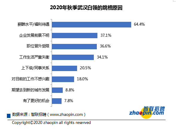 调研数据显示,64.4%的武汉白领表示“薪酬水平/福利待遇”是他们跳槽的主要原因,“企业发展前景不明”和“职位晋升受限”紧随其后,分别占比37.1%和36.6%。