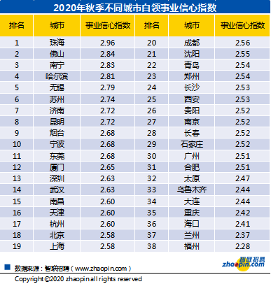智联招聘调研数据显示,一度因新冠疫情“封城”七十多天的武汉地区有56.5%的白领表示对2020年事业取得成就有信心,信心指数与去年相比有所提升,为2.63,甚至高于全国水平(2.58)。从排名上看,今年武汉在全国38个核心城市中排名第14,与去年秋季相比信心指数排名上升了18位。