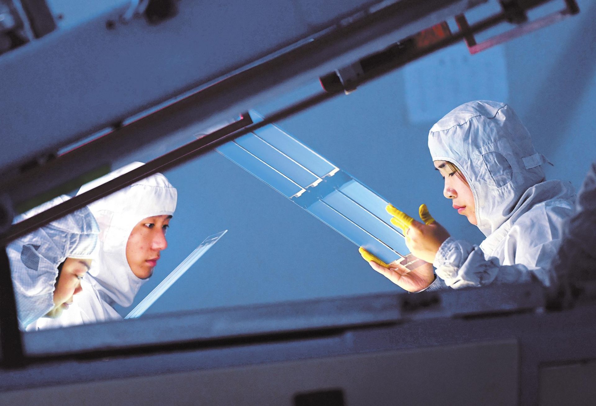 11月2日,位于襄阳东津新区的湖北方寸触控科技有限公司无尘车间内,技术人员对功能片做检验。该公司投资6亿元,建设5条中大尺寸液晶触摸屏生产线,日产量可达1万片,全年产值2.2亿元,产品远销欧美日韩东南亚等100多个国家和地区。(湖北日报全媒记者 田悦 通讯员 乔丽 谢勇 摄)