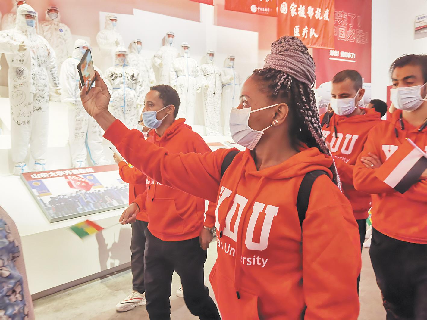 一张张肤色各异的年轻脸庞来自于埃及、也门、加纳、巴基斯坦、乍得等多个国家,他们和中国师生代表组成“感知中国·英雄之城学习访问团”到访武汉,抗疫展是此次武汉行的第二站。