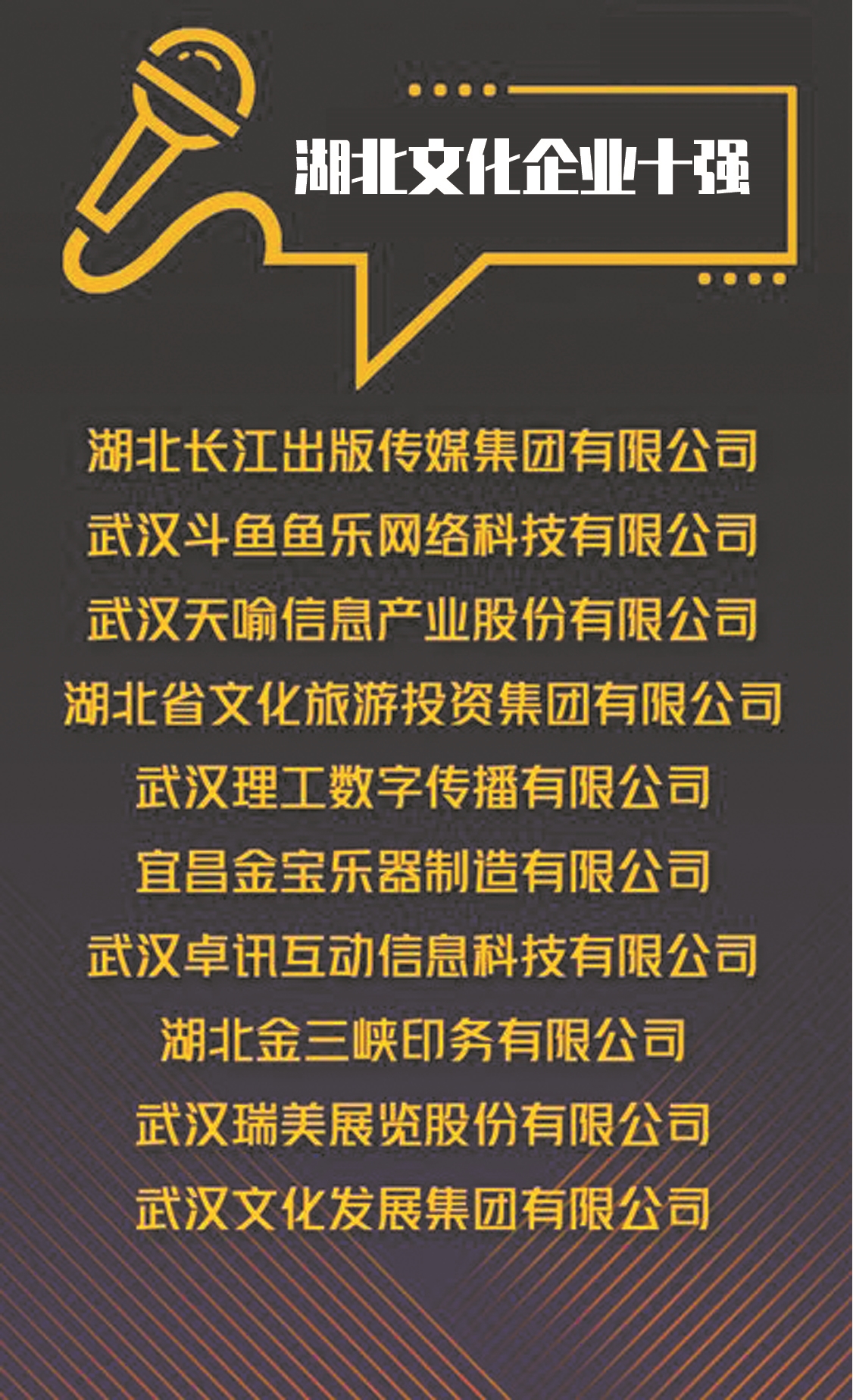 湖北文化企业十强为:湖北长江出版传媒集团有限公司、武汉斗鱼鱼乐网络科技有限公司、武汉天喻信息产业股份有限公司、湖北省文化旅游投资集团有限公司、武汉理工数字传播有限公司、宜昌金宝乐器制造有限公司、武汉卓讯互动信息科技有限公司、湖北金三峡印务有限公司、武汉瑞美展览股份有限公司、武汉文化发展集团有限公司。