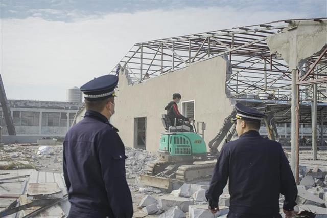 执法队员介绍,11月1日起,企业已开始进行自拆,今天主要拆除围墙和钢构拆除。预计,全部拆除和垃圾清理完毕需要三天时间。通过对该违建的整治拆除,创造优美舒适的居住环境,以使企业放心,使打工的青年们安心。