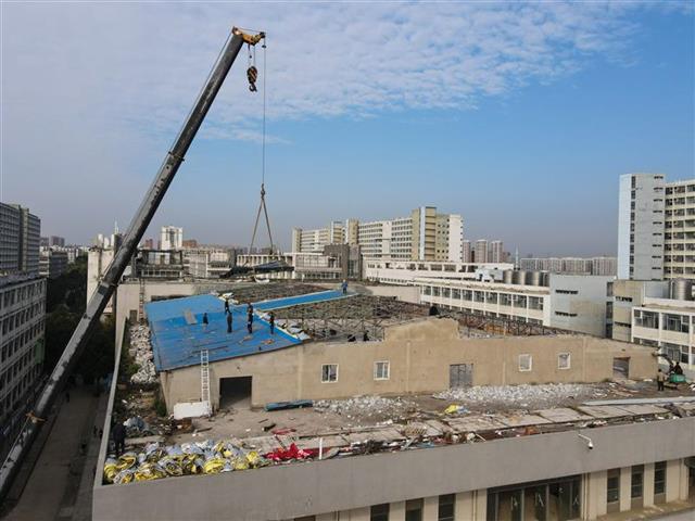 记者在现场看到,该处违建位于一栋生活配套用房的三楼楼顶,一楼为员工食堂和商铺。因为条件限制,大型机械无法作业,主要通过人工进行拆除。城管部门调来两台吊车和一台挖机进行帮拆,通过吊车将一辆小型挖机调到楼顶平台进行拆除,再利用吊车将拆除后的垃圾从楼顶吊运下来。为确保安全,作业区域内,现场已进行打围。