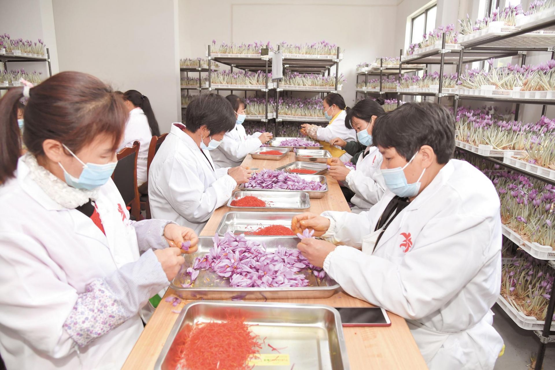 10月23日,萧山利川高科技农业示范园,工人们正在抽取西红花花丝。 (湖北日报全媒记者 魏铼 摄)