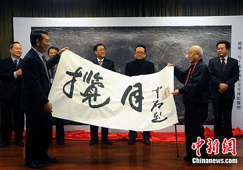 资料图:2012年,书法家欧阳中石(右)将自己为中国探月工程挥毫“揽月”的书法作品,赠送中国探月工程,中国探月工程总设计师吴伟仁代表工程接受赠送。中新社记者 孙自法 摄