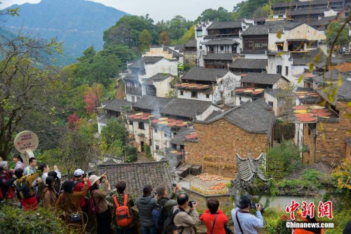 资料图:游客在江西省婺源县篁岭古村内观光、拍照。当日是立冬节气,古村家家户户趁着晴好天气晒出辣椒、玉米等秋收作物。中新社发 方华彬 摄