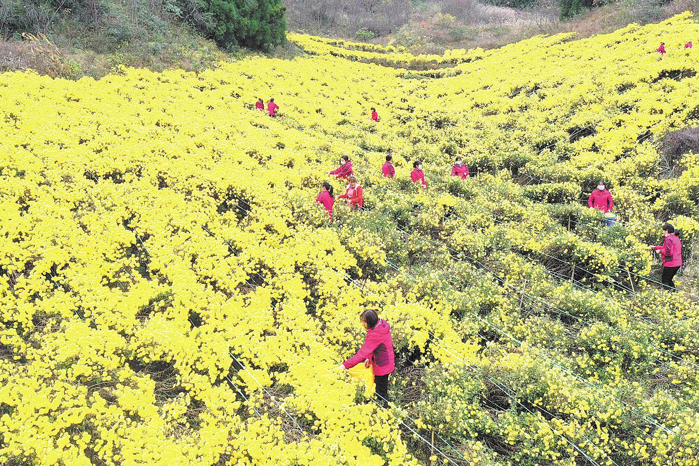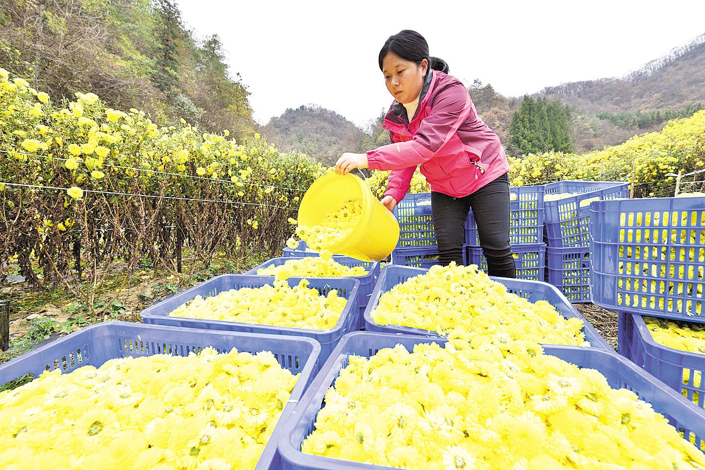 11月5日,在保康县马桥镇尧治河村菊花种植基地,村民正采摘皇菊并装筐。近年来,保康县采取“公司+合作社+农户”方式,发展观赏性强、经济价值高的菊花种植,把菊花加工成茶饮、药材等高附加值产品,带动当地农民增收致富。