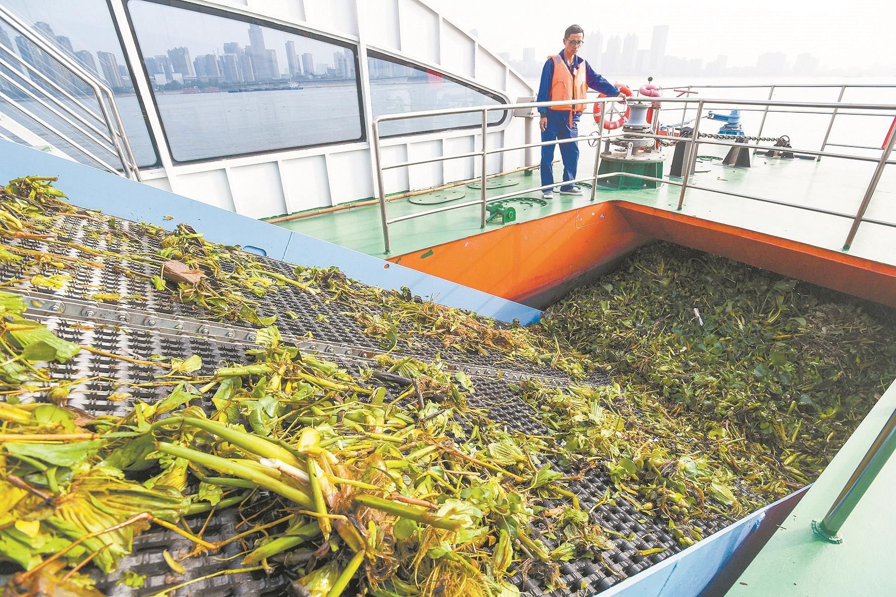 武汉市两江水域市容环境卫生中心主任张玉泉介绍,5年多以前,全靠人工划着木船清理水葫芦,一天不到百吨。市政府加大了长江水环境保护力度,先后添置了6艘机动清漂船,清漂能力每天可达500多吨。垃圾运输船装满水葫芦后,将运抵码头由垃圾压缩车运走处理,这在国内属于最先进的清漂方式。