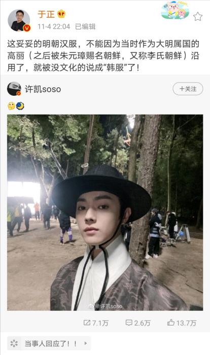 几天前,演员许凯在社交媒体晒出自己出演新剧《尚食》中的古装形象,却被网友质疑像“韩国古装电视剧”。近日,该剧制片人于正回应,“这妥妥的明朝汉服”,却“被没文化的说成‘韩服’了”。