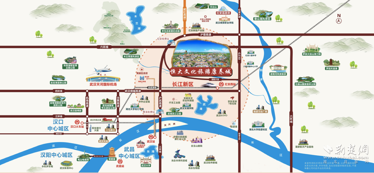 一空(天河机场),一港(阳逻港),两高(沪蓉高速、武麻高速),三铁(紧邻红安西站高铁站,30分钟内可抵武汉高铁站、汉口高铁站),多元立体化交通网正是恒大集团大手笔布局,以千亿级项目为引,释放区域潜力的原因所在。
