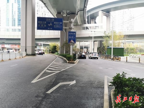 冉先生家住硚口,他每天接送孩子上学,都要经过硚口路解放大道路口。因修建了高架桥,硚口路分了主、辅路,从硚口路右转进入解放大道,主路车辆要在路口附近变道至辅路。