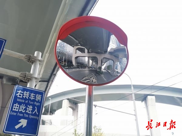 16日中午,记者驱车前往现场发现,从硚口路主路变辅路,由于驾驶员坐在车身左侧,后方又有绿化带和桥墩,通过右侧后视镜观察辅路车辆有些不便。在该路口绿化带上,已经安装了一块凹凸镜,镜子的确方便了驾驶员观察辅路情况。
