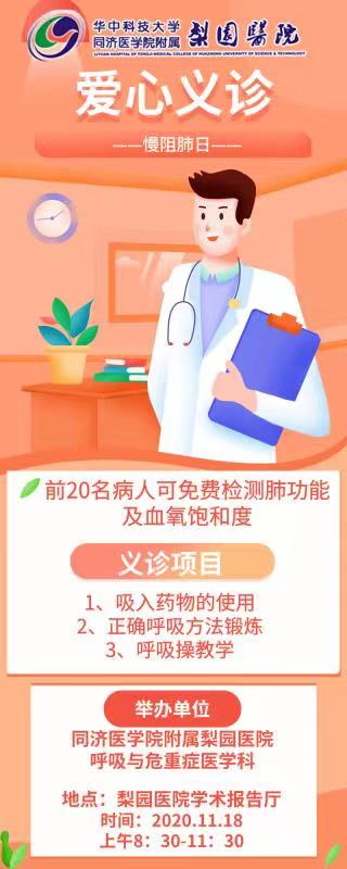 为提高慢阻肺知晓率,倡导患者早诊断、早治疗,11月18日上午,梨园医院呼吸与危重症医学科将在医院的学术报告厅为广大市民举办爱心义诊活动。