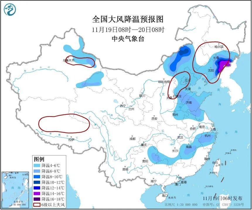 中央气象台预计,19日8时至20日20时,受中等强度冷空气影响,新疆东部、甘肃河西、东北地区大部、华北东部、黄淮东部、江南中南部等地将出现4~8℃降温。其中,吉林东部局地降温幅度可达12℃以上。