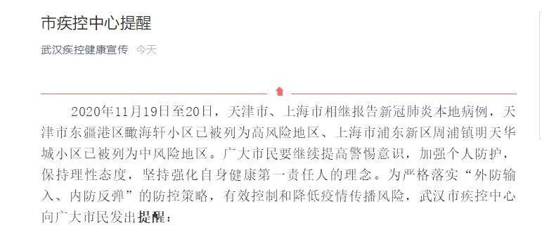 2020年11月19日至20日,天津市、上海市相继报告新冠肺炎本地病例,天津市东疆港区瞰海轩小区已被列为高风险地区、上海市浦东新区周浦镇明天华城小区已被列为中风险地区。广大市民要继续提高警惕意识,加强个人防护,保持理性态度,坚持强化自身健康第一责任人的理念。为严格落实“外防输入、内防反弹”的防控策略,有效控制和降低疫情传播风险,武汉市疾控中心向广大市民发出提醒: