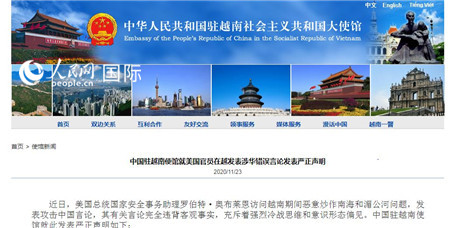 人民网河内11月23日电(记者 刘刚)近日,美国总统国家安全事务助理罗伯特·奥布莱恩访问越南期间恶意炒作南海和湄公河问题,发表攻击中国言论,其有关言论完全违背客观事实,充斥着强烈冷战思维和意识形态偏见。中国驻越南使馆就此发表严正声明如下: