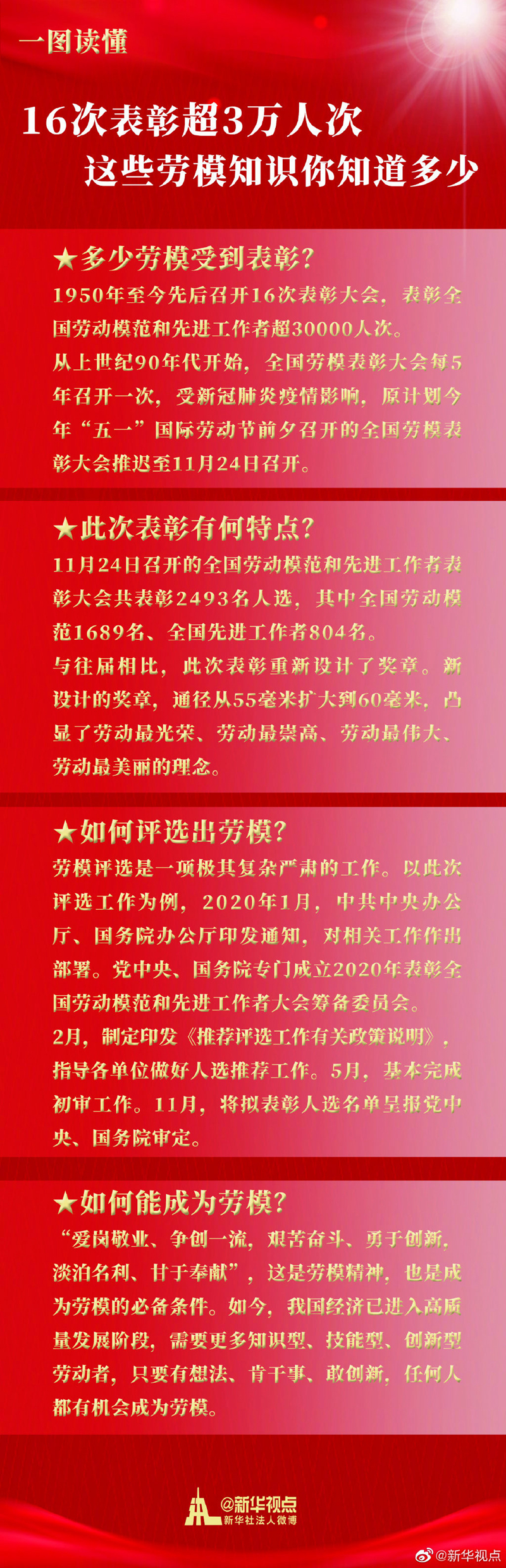 24日,1689名全国劳动模范和804名全国先进工作者在人民大会堂受到表彰,代表全体劳动者接受党和国家的最高礼赞。新中国成立以来表彰了多少劳模?劳模是怎样评选出来的?如何才能成为劳模?戳图了解↓