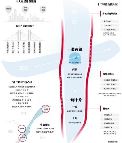 “一廊十片”打造武汉百里长江生态廊道,统筹布局十个错位发展的特色功能片区,包括三大古城历史风貌区、三大战略功能区以及四大特色区。