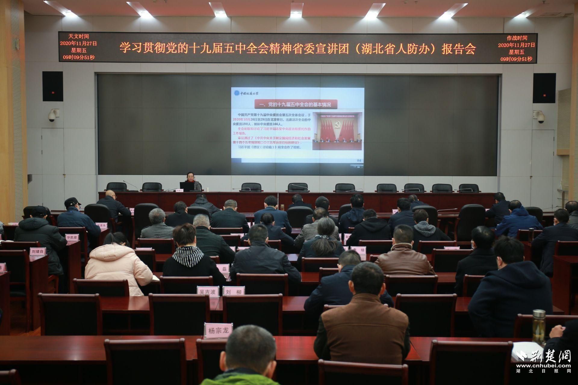荆楚网客户端—荆楚网消息(记者肖慧婷 通讯员高坤林)11月27日上午,学习贯彻党的十九届五中全会精神省委宣讲团(湖北省人防办)报告会举行。省委宣讲团成员,中国地质大学马克思主义学院院长、教授、博士生导师高翔莲作宣讲报告,省人防办党组成员、副主任刘红洲主持会议。