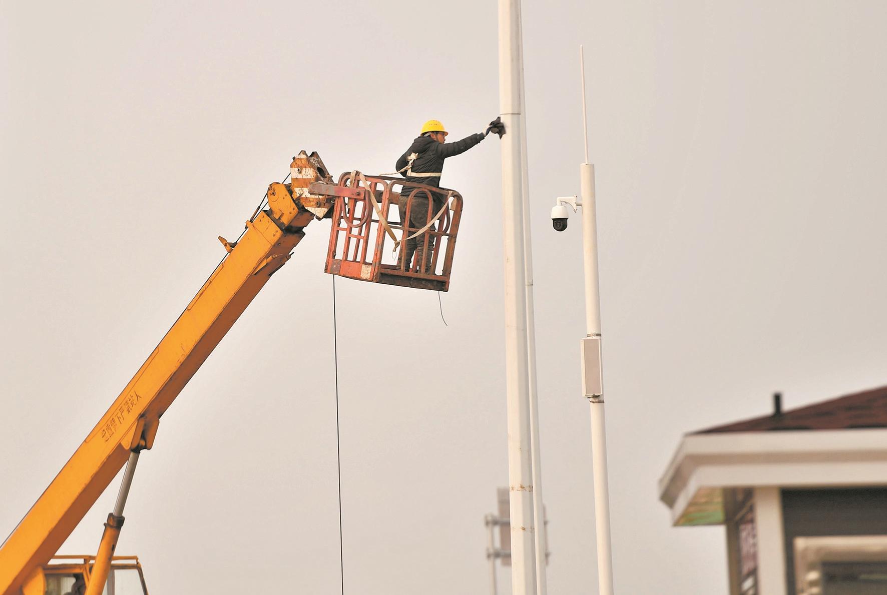 工作人员正在擦洗四环线边的路灯杆