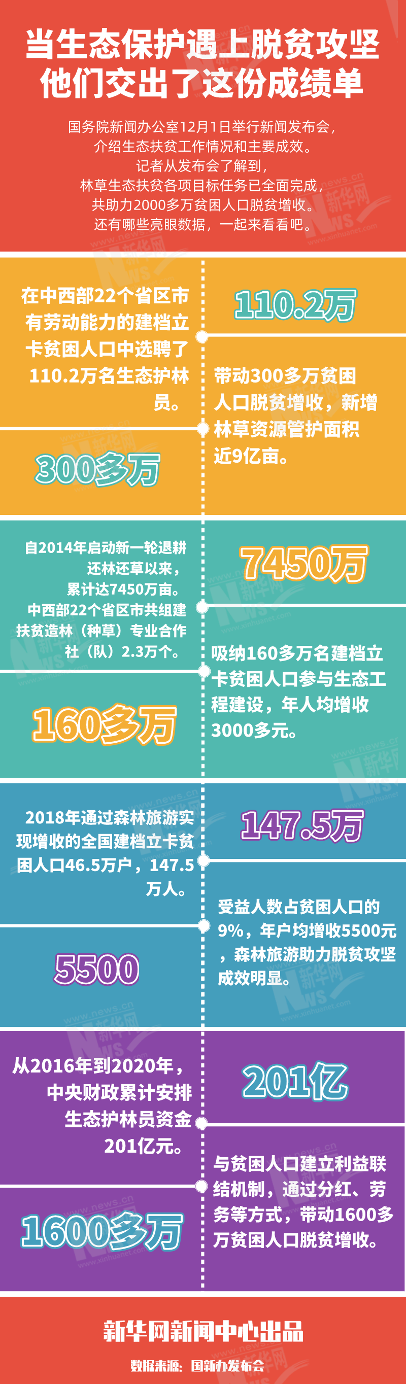 新华网北京12月1日电(汪亚)国务院新闻办公室于今日举行新闻发布会,介绍生态扶贫工作情况和主要成效。国家林业和草原局副局长李春良在发布会透露,党的十八大以来,林草生态扶贫各项目标任务全面完成,在推进生态补偿扶贫、推进国土绿化扶贫、推进生态产业扶贫、推进定点帮扶县脱贫摘帽等四大方面发力,共助力2000多万贫困人口脱贫增收。