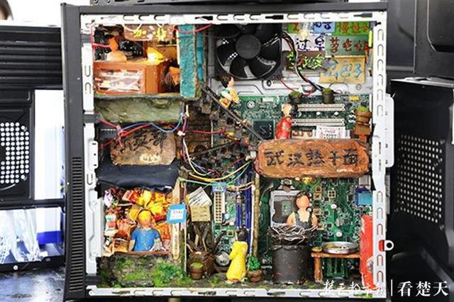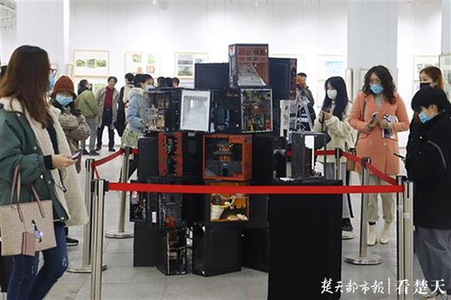 不少观展师生被2018级戏剧影视美术设计专业学生作品——《武汉一隅》深深吸引。《武汉一隅》是作者以环保与重复利用为理念,利用废旧机箱作为创作载体,结合影视场景设计的手法,在现武汉疫情期间的场景片段创作而成,带领观众重温英雄之城的感动瞬间。