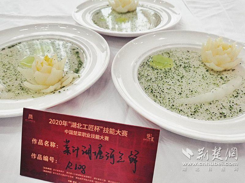 在热菜项目上,选手们纷纷将对湖北人民同心抗疫的感悟倾注到作品中,是本届大赛上最温情的瞬间。东湖宾馆国宴主厨程双喜的参赛作品名为“曙光之舟”,红薯刻舟,意指抗疫胜利的曙光,以致敬全国人民同舟共济、乘风破浪的精神。选手蔡勇端的作品“楚之润”用食材凸显荷花造型的精致细腻,形象地展现了“惟有绿叶红菡萏,卷舒开合任天真”的场景,表现荆楚大地物产丰富的特点;舒展的荷叶如同灵动挥舞的双手,表达着武汉对全国人民的感谢之情。