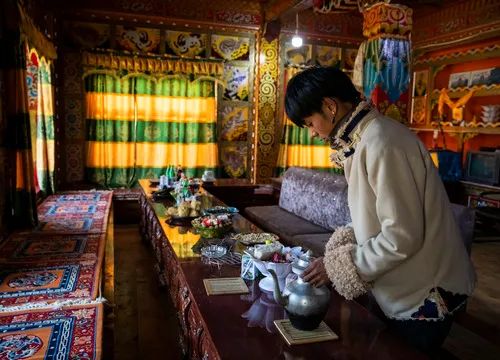 12月2日,在回到位于四川省甘孜藏族自治州理塘县格聂雪山下的家后,丁真为客人们倒酥油茶。新华社记者 沈伯韩 摄