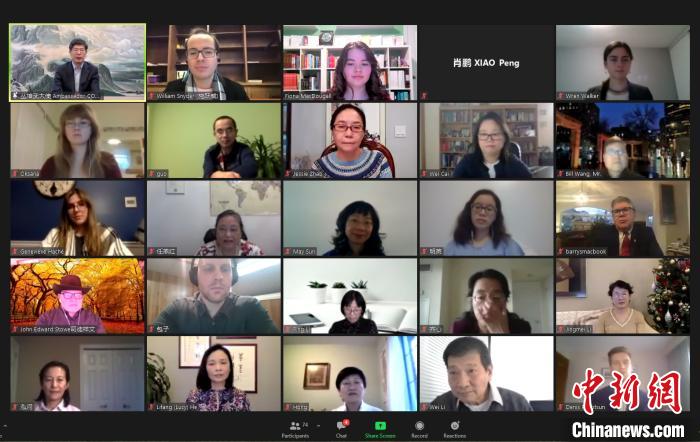 图为中国驻加拿大大使丛培武(第一排左一)致辞。 网络会议视频截屏