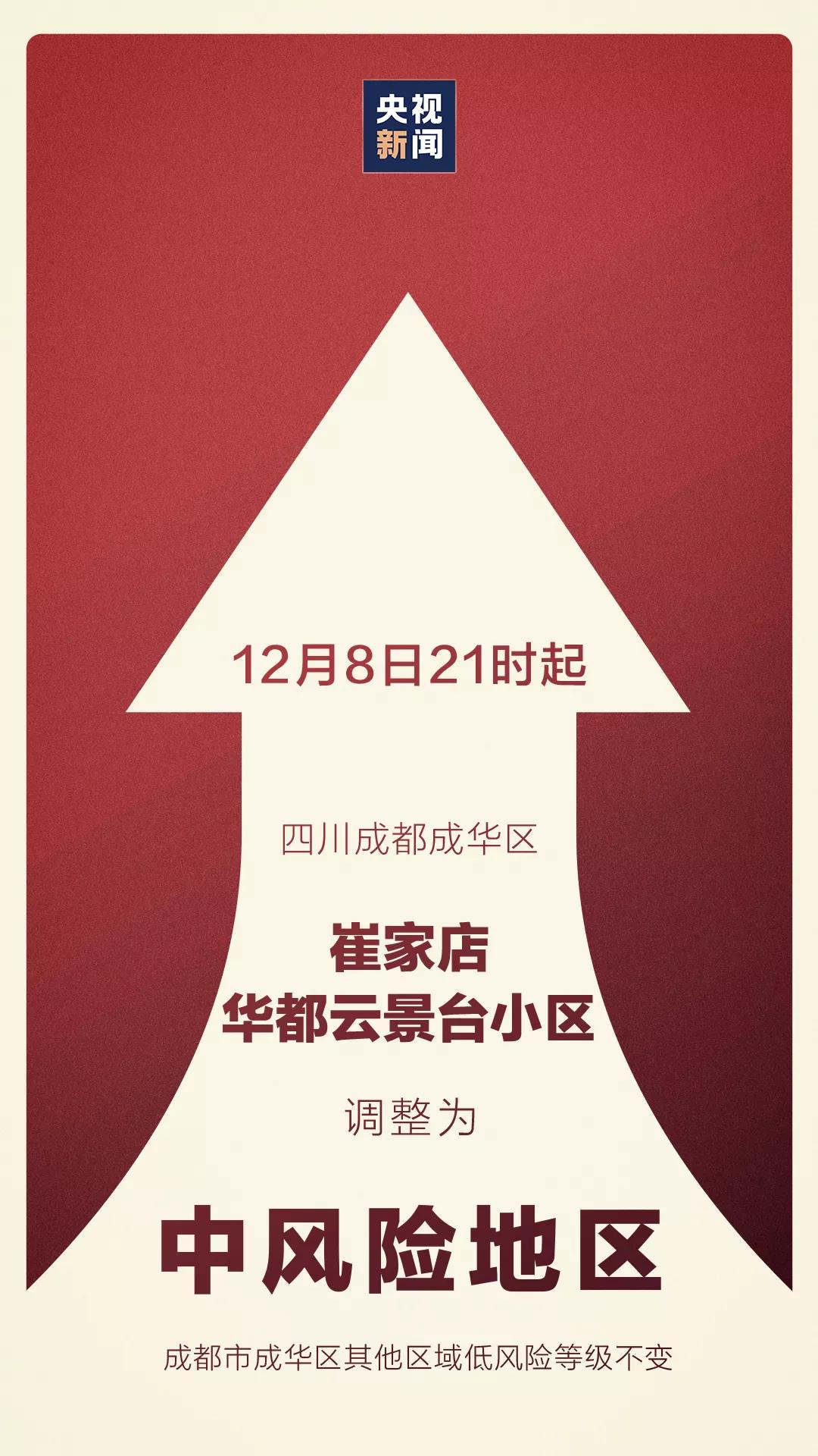 经成都市成华区新冠肺炎疫情防控指挥部研究决定:自12月8日21时起,将成都市成华区崔家店华都云景台小区的风险等级由低风险调整为中风险。成都市成华区其他区域低风险等级不变。