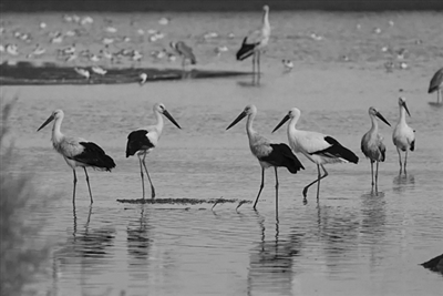 东方白鹳在唐山市曹妃甸湿地觅食。曹妃甸拥有湿地天然的盐碱地属性和缺水、高蒸发的气候特点,当地通过卤虫养殖来实现卤水湿地保持,而且卤虫自身价值高,因此是一举多得的修复措施。新华社记者 杨世尧摄